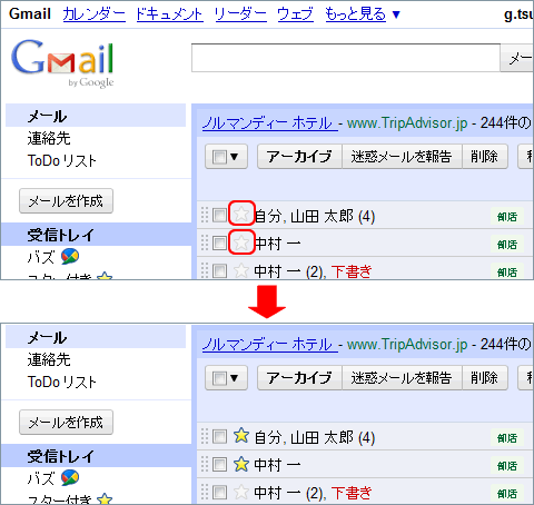 重要なメール、後で何らかの対応を必要とするメールなどにスターマークをつけることで、受信トレイを見た時に目に留まるようにする機能です。